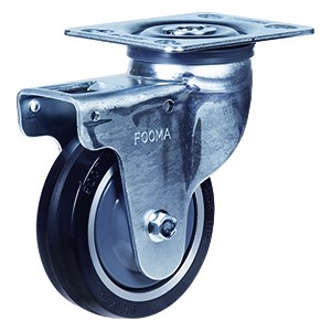 支架: 冲压脚轮座,使用强化热处理的双重钢珠槽旋转结构,一体化冲压支架,使用旋转部位防尘盖,可同时锁轮子和旋转部位的踏板双刹系统,螺栓式轮轴紧固构造